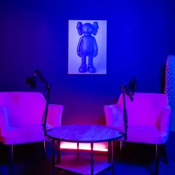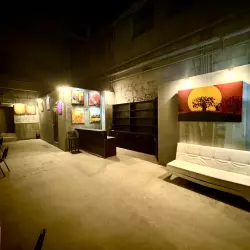 зал арт включает: бар, библиотека (книги, кресла), лофт с фактурными стенами, зеркалом с лампочками и диваном, фауторно-мозаичная стена (плюс пуфики, гитара, комбик, магнитофон, куб), песочный пляж, мастерская художника
