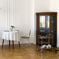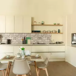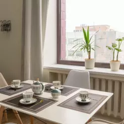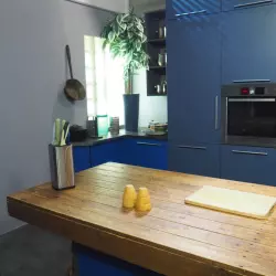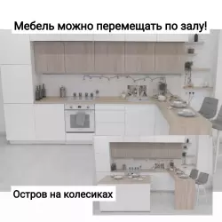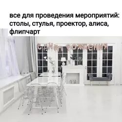 Рабочая кухня со сменными фасадами. Остров на колесах с индукцией. Много окон со шторами блэкаут. Диван, кресла, стеллаж, два обеденных стола, много посуды и реквизита.