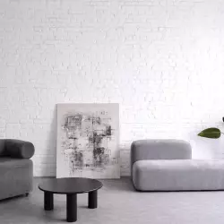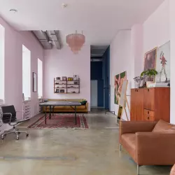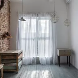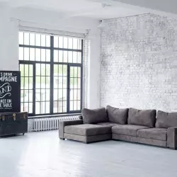 Светлый лофт с большой циклорамой.8x5 м. Большие окна на солнечной стороне, стена из белого кирпича и яркая акцентная мебель.