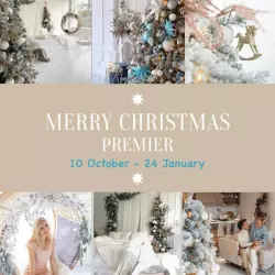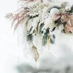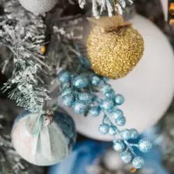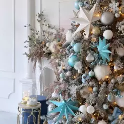 - Каминная зона с бело-голубо-золотой елью, подвесными звездами и лошадкой-качалкой;