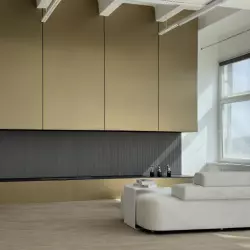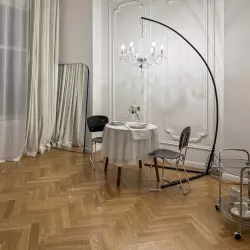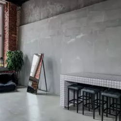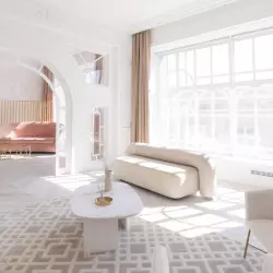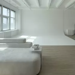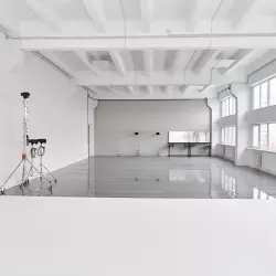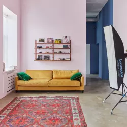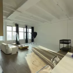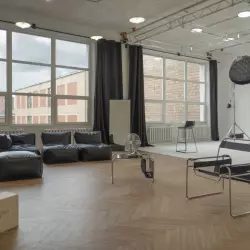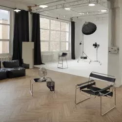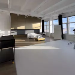 Большой зал 105м2 в современном стиле и дизайнерской мебелью 9-ти метровая циклорама с подогревом пола и двумя моторизированными фермами позволят с комфортном проводить съемки любого уровня Зал расположен на закатной стороне зала, благодаря переотражениям от соседних белых и стеклянных зданий, в зале целый день мягкий рассеянный солнечный свет