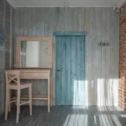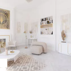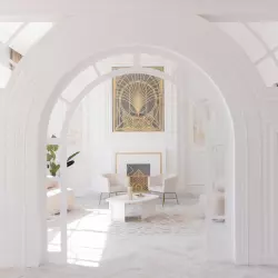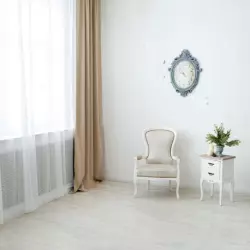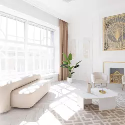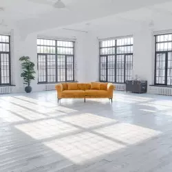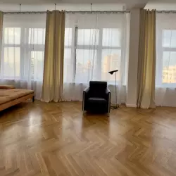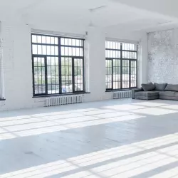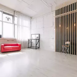 Светлый зал с тремя панорамными окнами. В зале есть локации офиса, гостиной, спальни. Много мебели и реквизита. Шторы блэкаут на всех окнах.