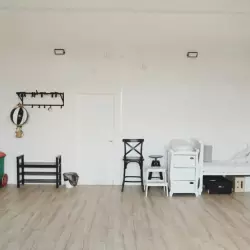 Минималистичный зал, большое окно, высокие потолки, стационарная система подвеса фонов. Возможность установки любого фона из наличия, гримёрное место.