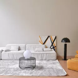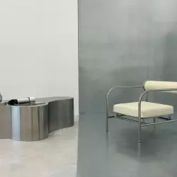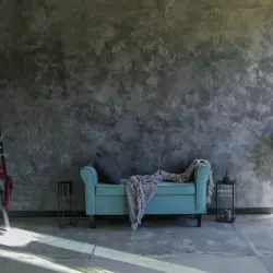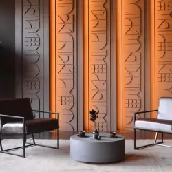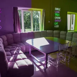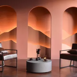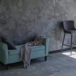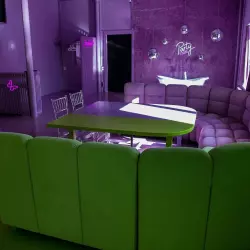 Grigio - зал с необработанным наливным полом, создающим интересную фактуру, дизайнерской мебелью и цветными фонами