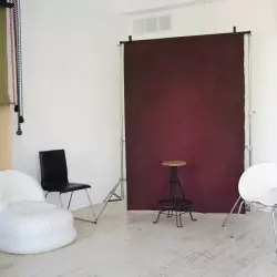 Интерьерный светлый зал с огромными панорамными окнами, выходящими на юг, что даёт яркий падающий свет в дневное время, возможность полного затемнения. Белый пол, наибольшая концентрация современных трендов и фактурных зон в одном зале. Возможность установки любого фона из наличия, высокие потолки, гримёрное место.