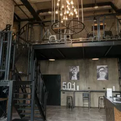Исторический зал в стиле лофт в белом кирпиче с большими арочными окнами.