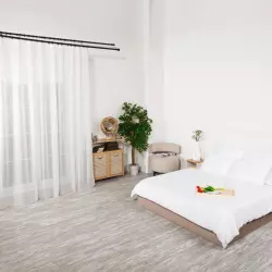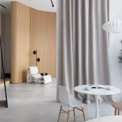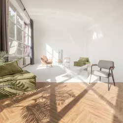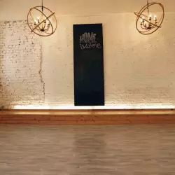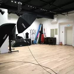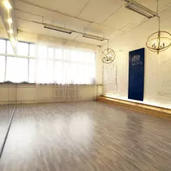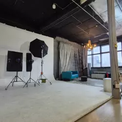 Минималистичный светлый зал с белыми стенами, циклорама, высокие потолки, деревянный пол, отсутствие окон даёт возможность полного затемнения зала, кондиционер. Возможность установки любого фона из наличия, гримёрное место.