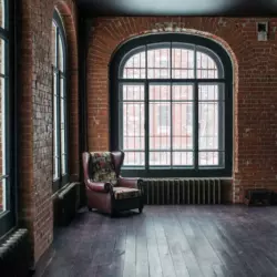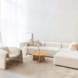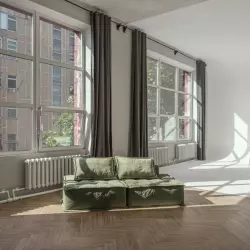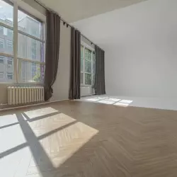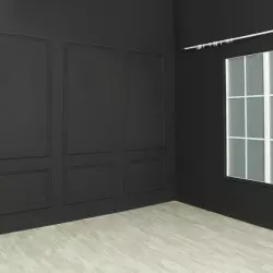 Минималистичный зал для работы на циклораме, с нейтральной бежевой стеной и "теплой мраморной" локацией. Отлично подойдет для каталожных съемок и модельных тестов, рассветная сторона здания, яркие солнечные лучи в первой половине дня, на циклораме до обеда