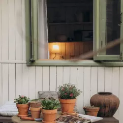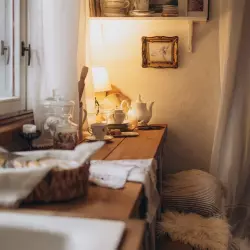 При аренде дачи снимать можно везде: в домике и на улице. В домик 30 кв. м., настоящая дровяная печь, много винтажного декора и текстиля, аренда гардероба.