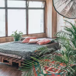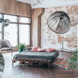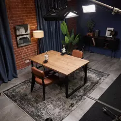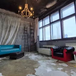 Интерьерный зал с тропическим колоритом. Огромные панорамные окна, выходящие на юг, что даёт яркий падающий свет в дневное время, возможность полного затемнения. Интересные локации и разнообразие реквизита, большая кровать. Возможность установки любого фона из наличия, высокие потолки, гримёрное место.