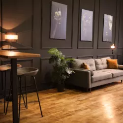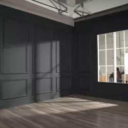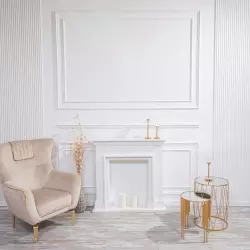 Зал в серых тонах в стиле неоклассики, минимализма и лофта.