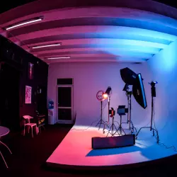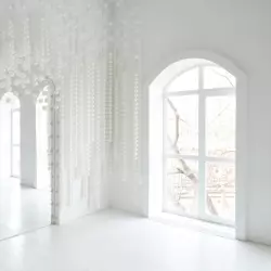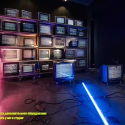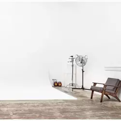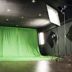 Недорогая белая циклорама, Полностью белый зал (стены, пол, потолок). Зал экранирован от эха для записи чистого звука.
