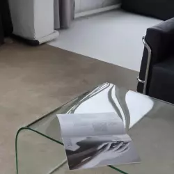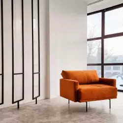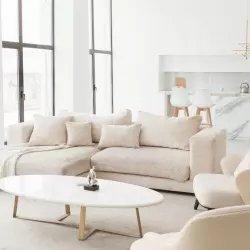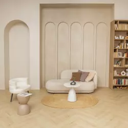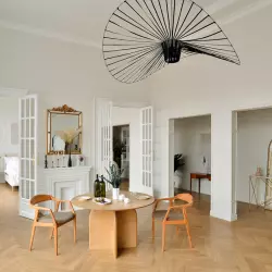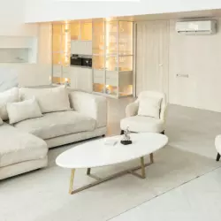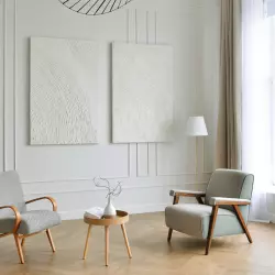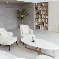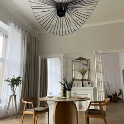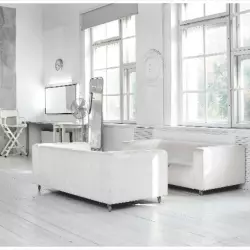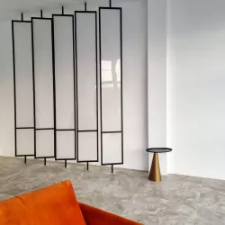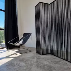 Студия в светлых тонах с декоративными металлическими рейками, изысканной мебелью. Зал находится на солнечной стороне, а панорамные окна в пол придают залу свою изюминку.