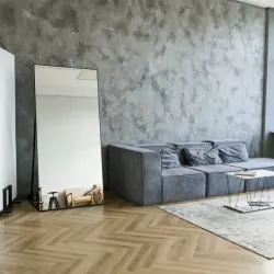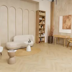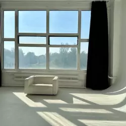 Просторный светный зал с 3- огромными окнами на солнечной стороне. Белые стены. Стильный бентонный пол.