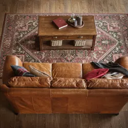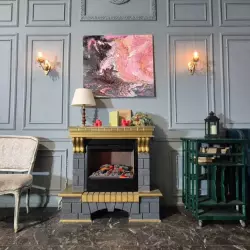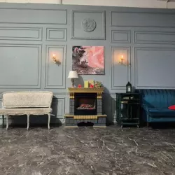 Интерьерный зал с большим диваном, дверями из сталинки и камином