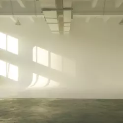Зал на солнечной стороне здания с фактурными стенами и белой угловой циклорамой с подогревом пола