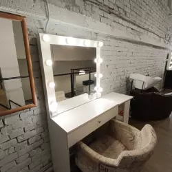 Комфортный недорогой зал.Большая текстурная стена.Различные стулья, кресла, небольшой диван.Деревянная стена.Осветительная рама - кольцо.Белая стена. Школьная фотозона.Фоновая система с цветными бумажными фонами.Гримерный стол.