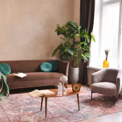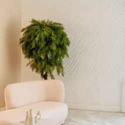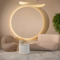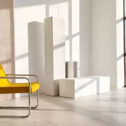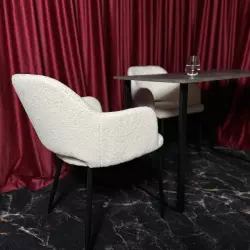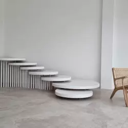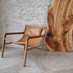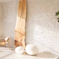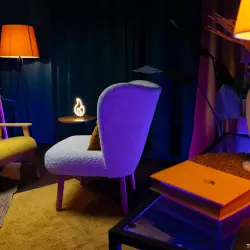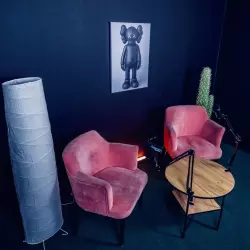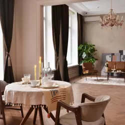 Студия 35 выполнена в балийском стиле, две фактурные стены, одна из них дополнена деревянным слебом. в зале имеется лестница с круглыми ступенями, кресла из натурального дуба и кожи и также имитация больших булыжников.