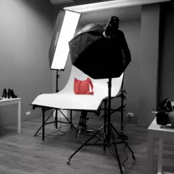 Небольшая студия с серыми стенами без окон, хорошо подходит для предметной съемки съемки портретов и каталогов