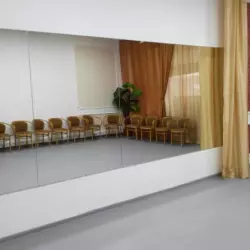 Светлый и просторный зал оборудованный 10 рабочими местами для визажистов с профессиональной подсветкой. С обратной стороны стена с зеркалами в полный рост. На одной из стен расположен экран для проектора и крепления для фонов.