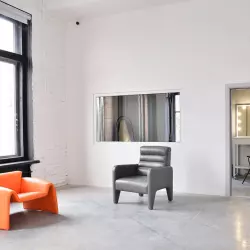 Минималистичный интерьер в индустриальной стилистике: бетон, металл, большие окна, дневной свет, дизайнерская мебель, огромная мобильная стена с окном, позволяющая легко трансформировать помещение.