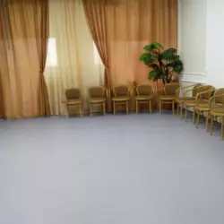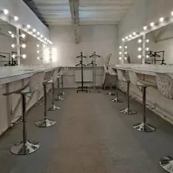 Просторная гримерная комната с двумя рабочими местами, большими окнами, телевизором и всем необходимым для комфортного и полезного пребывания.