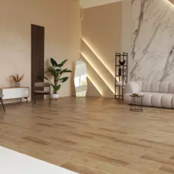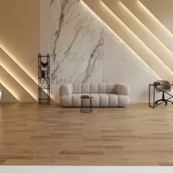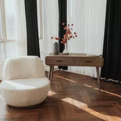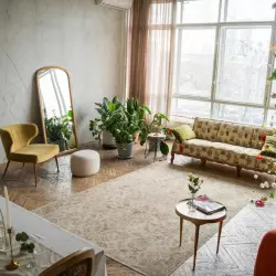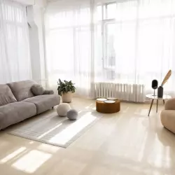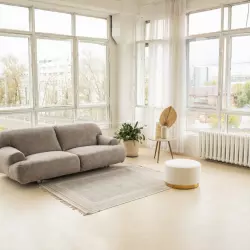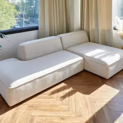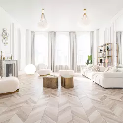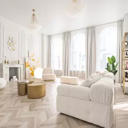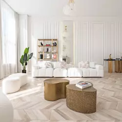 Светлое пространство с естественным светом, уютной аркой, стильным диваном и полом в "елочку".
