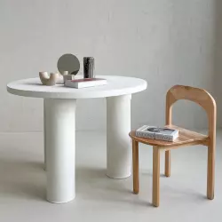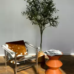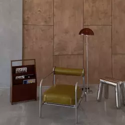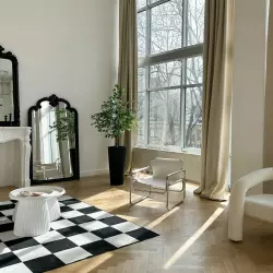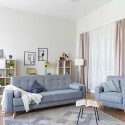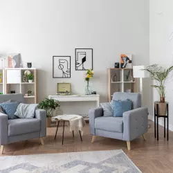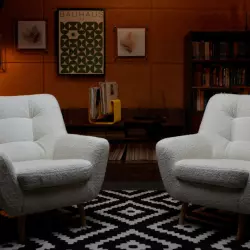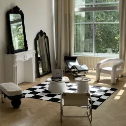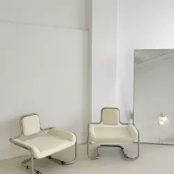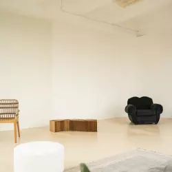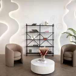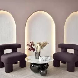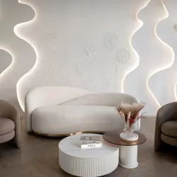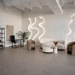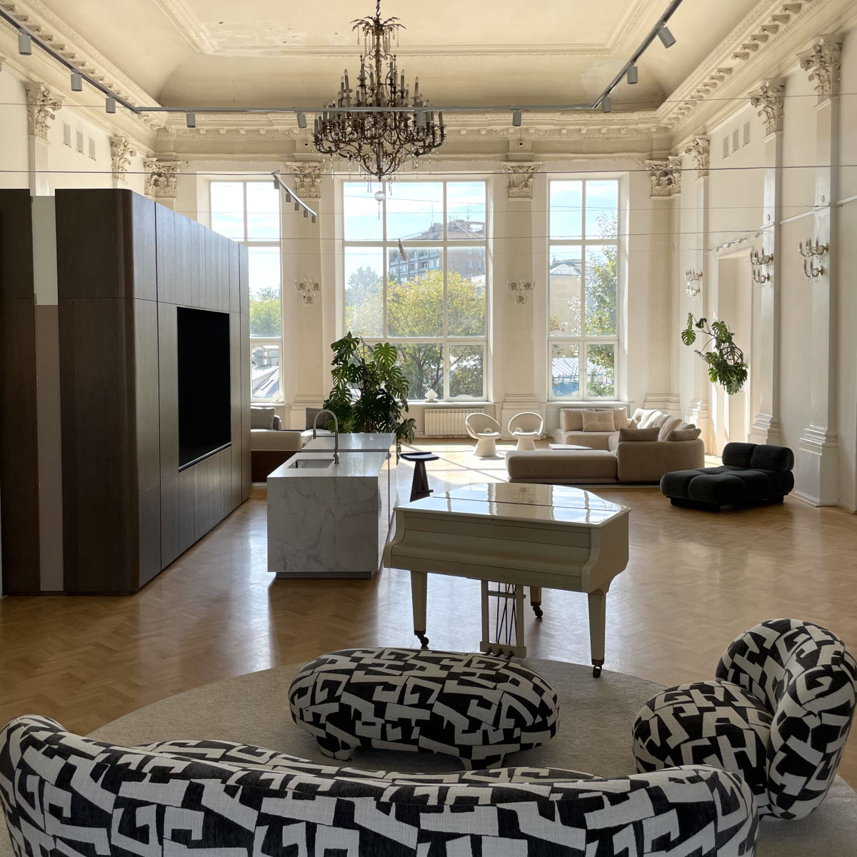 Интерьерный зал 86 м² со светлыми стенами и дизайнерской мебелью