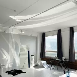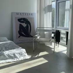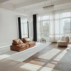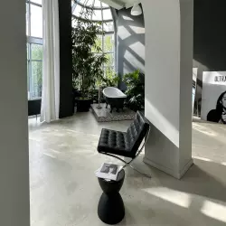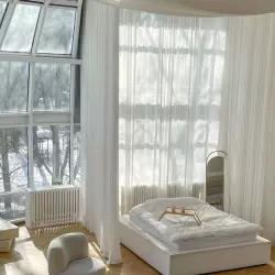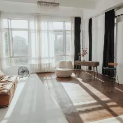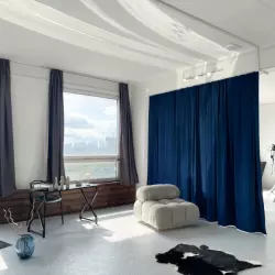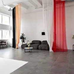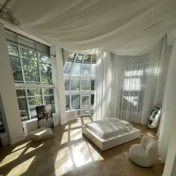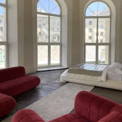 Просторное помещение с высокими потолками, панорамными окнами, неоновой подсветкой и блэк-аут шторами для полного контроля над светом. Уютная зона отдыха и удобное расположение сделают процесс съемки комфортным.