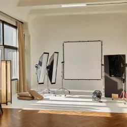 Импульсный свет Godox, циклорама, панорамные окна, интерьерная зона с мебелью, дневной свет с 10:00 до 16:00.