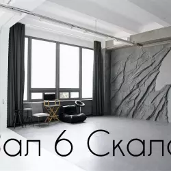 Зал с большой белой угловой циклорамой с непачкающейся краской и реалистичной скалой на стене.