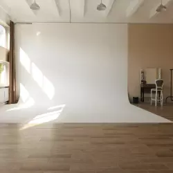 зал с белоснежной циклорамой 5 метров и с большим количеством естественного света, есть блэкаут шторы