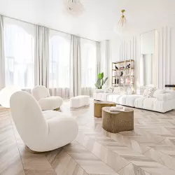 Историческое пространство с лепниной, паркетом, эркерными окнами в пол и современной мебелью.