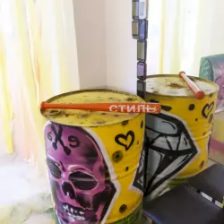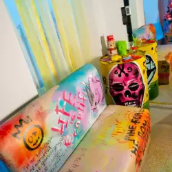 Яркая локация с граффити и элементами уличной культуры и поп-арта