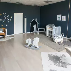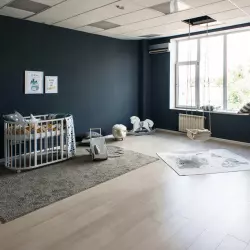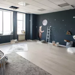 Просторный светлый зал, оформленный в стиле современной модной детской комнаты. Идеально подойдет для съёмки семей из 2-4 человек и отдельно детей.