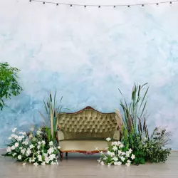 Минималистичный светлый зал с белыми стенами, циклорама, драпировочные ткани, возможность установки любого фона из наличия.