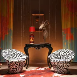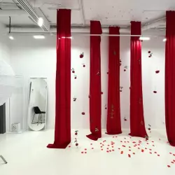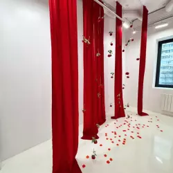 Локация с розовым мехом, красные шторы и розы