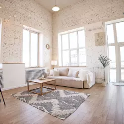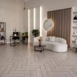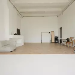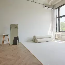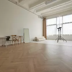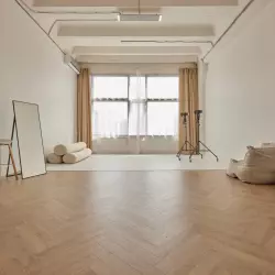 Светлый зал площадью 60 кв.м. Идеально подходит для съемки контента. Зал состоит из двух зон: белой стены с белым полом, соединяющимися под прямым углом, и интерьерной зоной со светло-бежевым паркетом, уложенным венгерской елкой, и имитацией камина.