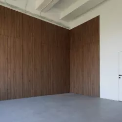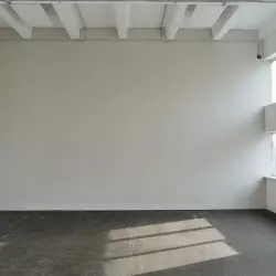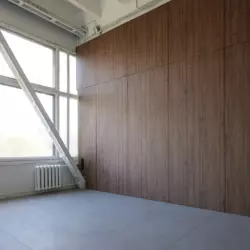 33м2 Бюро "33" Светлый белый зал с естественным освещением, деревянными стенами и бетонным полом