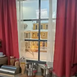 Зал "RED" с различными зонами для съемок, зона с красной бархатной шторой, циклорама 5x5, окна по всему периметру.