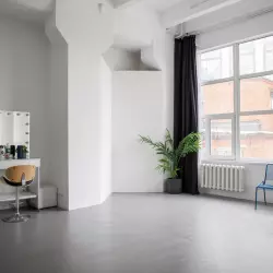 Светлый просторный лаконичный зал 75 кв.м с циклорамой и огромными окнами. Фактурные стены: гипсовая, белая, серая бетонная и бетонный пол. Студия подходит для съемки каталога, лукбука, портретов, модельных тестов, творчества и съемок видео с идеальной тишиной.
