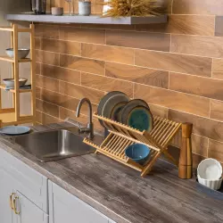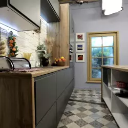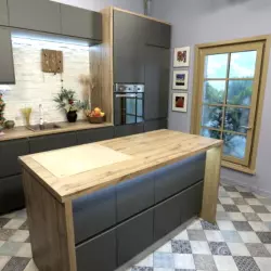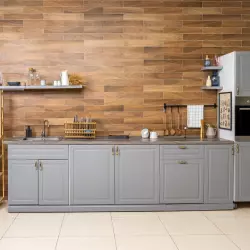 Элегантная кухня в стиле минимализм. Стена "под дерево", серая столешница и фасады. Рабочая зона в виде мобильного "островка" со сплошной столешницей.