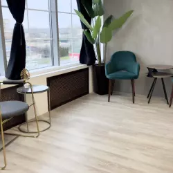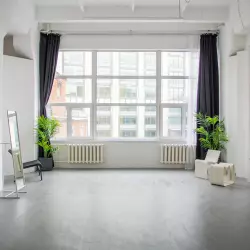 Светлый зал с несколькими локациями. Мягкий свет из окон, имитирующий дневной, обеспечивает съёмку независимо от освещения за окном
