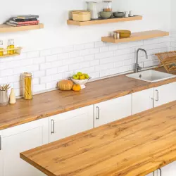 Светлая кухня с однотонными стенами, фартуком, фасадами белого цвета и столешницей из светлого дерева.