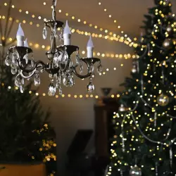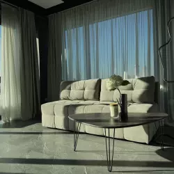 Панорамные окна, тёплый свет, стиль.