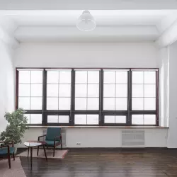 Небольшой светлый зал с тремя окнами, бумажными фонами и стильными интерьерными зонами. Для портретных, съёмок лукбуков, брендов, маркетплэйсов, портфолио.