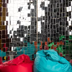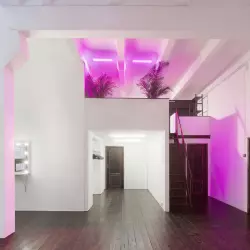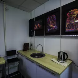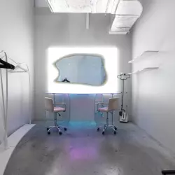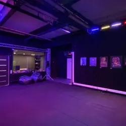 Зал без окон с неоновой локацией, стилизованной стеной под белую плитку, металлической зоной и огромным круглым светильником на потолке, так же в зале имеется гримерный стол и примерочная
