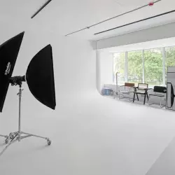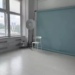 Минималистичный светлый зал с белыми стенами, большое окно во всю стену с возможностью полного затемнения, циклорама. Возможность установки любого фона из наличия, гримёрное место.