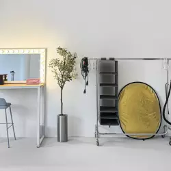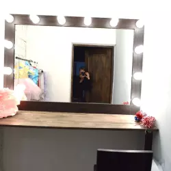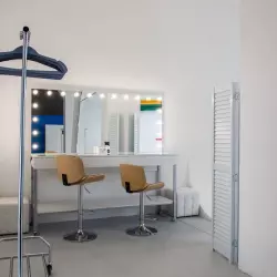 Наша гримерка светлая и просторная, рассчитана на 2 посадочных места, большое зеркало, профессиональная подсветка, а также рейлы для одежды.