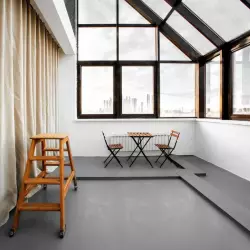 Минималистичный интерьер в индустриальной стилистике: бетон, металл, большие окна, дневной свет, дизайнерская мебель, огромная мобильная стена с окном, позволяющая легко трансформировать помещение.